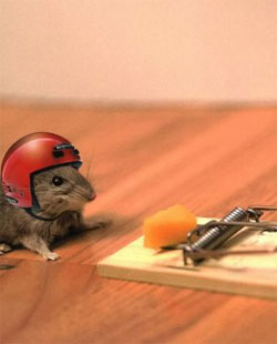 Tipul: Păi nu este o simplă cursă de şobolani. Staţi să vă arăt… Am aici o placă de lemn care are pe mijloc o lamă de cuţit cu tăişul orientat spre exterior. La capetele acestei lame se află o bucată de brânză, respectiv una de slănină.