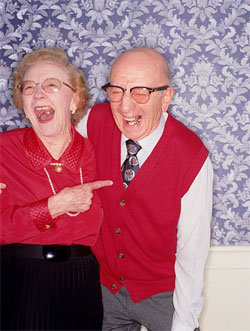 După vreo douăzeci de minute, bătrânelul iese din bucătărie cu un platou cu felii de şuncă şi ouă pe care îl depune în mâinile consoartei. După ce se uită la platou, bătrânica explodează: