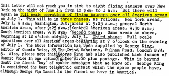This letter will not reach you in time to sight flying saucers over New York on the night of June 13, from 10 p.m. to 1 a.m. But there will again be full-scale operations of flying saucers over all American areas on July 1. This will be in three phases as follows: New York Areas, July 1, 9 a.m.; Washington, D.C. areas at 9:25 a.m.; general North American areas, after 9:25 a.m.; Central American areas, 9:30 a.m.; South American areas, 9:35 a.m. Second phase: Same areas as above, beginning at 12 o’clock mid-day, July 1. Third phase: Full-scale operations over all American areas beginning at 7 o’clock on the evening of July 1. The above information has been supplied by George King, editor of Cosmic Voice, 88 Drive Mansions, Fulham Road London S.W. 6. Also, please note that George King has also published back issues of Cosmic Voice in one volume price of $1.00 plus postage. This is beyond doubt the finest “buy” saucer messages that we know of. George King is considered the best telepathic contact which the space people have, although George Van Tassel is the finest we have in America.