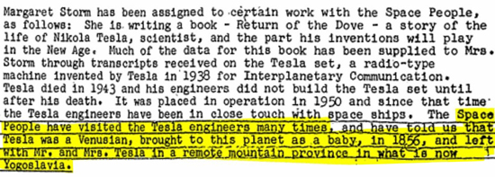 Margaret Storm has been assigned to certain work with the Space Popel, as follows: She is writing a book – Return of the Dove – as a story of the life of Nikola Tesla, scientist, and the part his inventions will play in the New Age. Much of the data for his book has been supplied to Mrs. Storm through transcripts received on the Tesla set, a radio-type machine invented by Tesla in 1938 for interplanetary communication. Tesla died in 1943 and his engineers did not build the Tesla set until after his death. It was placed in operation in 1950 and since that time the Tesla engineers have been in close touch with the spaceships. The Space People have visited the Tesla engineers many times, and have told us that Tesla was a Venusian, brought to this planes as a baby, in 1856, and left with Mr. and Mrs. Tesla in a remote mountain province in what is now Yugoslavia.”