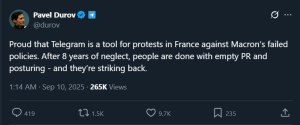 Sunt mândru că Telegram este un instrument pentru protestele din Franța față de politicile eșuate ale lui Macron. După 8 ani de neglijență, oamenii s-au săturat de PR-ul gol și ripostează”, scrie acesta pe X.
