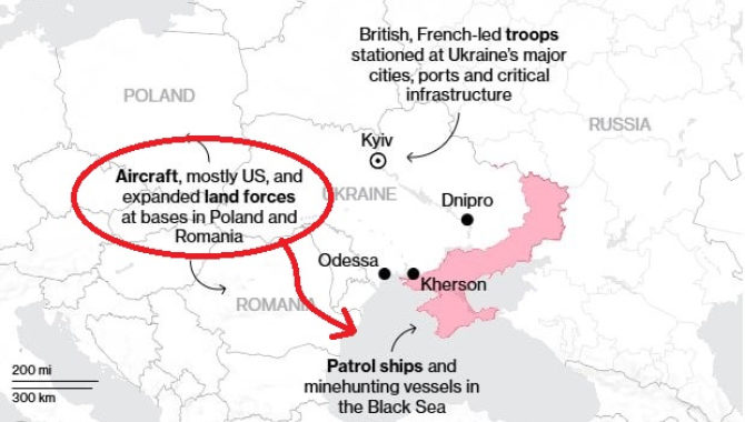 Potrivit Bloomberg, conform planurilor Europei, aviația aliată ar urma să aibă bază în Polonia și România. Există, de asemenea, posibilitatea de a patrula Marea Neagră cu nave și nave de tip vânător de mine.