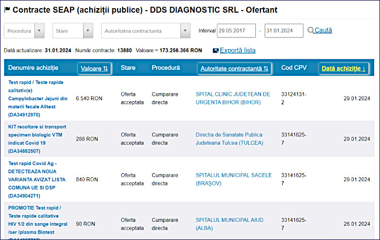 Dar această sumă este doar o picătură într-un pahar: DDS Diagnostics SRL are 13.880 de contracte cu statul în valoare de 173.256.366 RON ‒ aka 34,5 milioane de euro, scriu cei de la Anchetatorii.