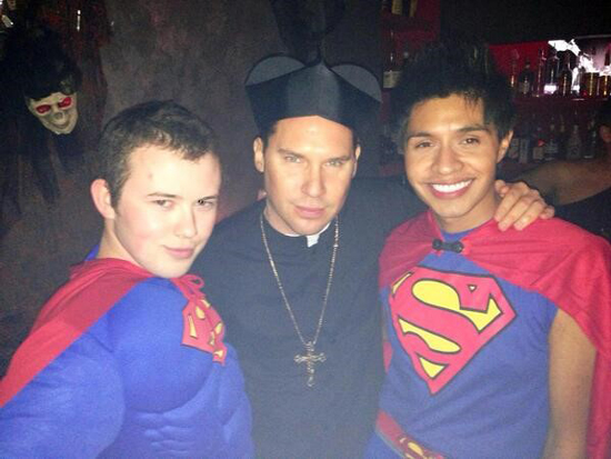 Here, Singer is dressed as a Catholic priest… at a time they were being accused of abusing children. How appropriate.