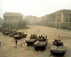 Nicolae Ceauşescu, cel care refuzase reformele după modelul lui Gorbaciov, a fost alungat de la putere printr-o lovitură de palat. Anterior, la mijlocul lunii decembrie, debutaseră proteste la Timişoara, pe care Ceauşescu le-a reprimat sângeros. Pe 21 decembrie, au izbucnit la Bucureşti şi în alte oraşe lupte de stradă. Armata s-a solidarizat cu demonstranţii. Pe 22 decembrie, Ceauşescu este alungat de la putere, o zi mai târziu este capturat împreună cu soţia sa, Elena. Pe 25 decembrie cei doi sunt condamnaţi la moarte de un tribunal militar convocat în mare grabă, puşi la zid şi executaţi.