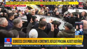 La sediul Curții de Apel București, s-a adunat un grup numeros de susținători ai candidatului suveranist blocat de sistem, care au fluturat steaguri tricolore și afișe cu mesaje patriotice.