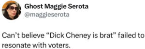 Așadar, pentru a-și lansa campania, Kamala s-a asociat cu schema de marketing a unui album pop care se învârte în jurul tinerelor fete care sunt dezordonate, consumă cocaină și petrec toată noaptea. A funcționat pentru Charli XCX pentru că treaba ei este să facă muzică de petrecere. Dar Kamala Harris încerca să devină, la propriu, președintele Statelor Unite. De asemenea, în totală opoziție cu această vibrație, ea a călătorit în țară cu Liz Cheney, fiica celui mai malefic ațâțător la război din istoria Americii.