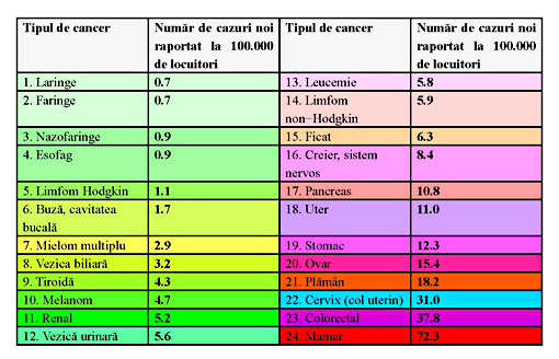 În ceea ce priveşte ţara noastră, se pot observa anumite valori de „top” pentru diferite tipuri de cancer (pulmonar, colorectal, gastric) comparativ cu alte zone sau regiuni ale lumii, pe anumiţi ani în mod specific. Astfel, spre exemplu, studiul care a purtat numele de Globocan, realizat în 2008 la nivel mondial, a putut obiectiva frecvenţa numărului noi de cazuri şi a deceselor asociate diferitelor tipuri de cancer pe regiuni specifice şi în ţările lumii, inclusiv România (tabelul de mai jos).