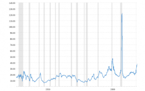 Datele sunt din 1928 până în prezent. Benzile cu gri reprezintă perioadele de recesiune. Anul 1990 este prima dungă gri de dinaintea anului 2000. Nu întâmplător l-am luat ca reper. Dacă ne uităm de la începutul graficului, vom observa că până în anul 1990 evoluţia P/E variază între 10 şi 20. De fiecare dată când se depăşeşte valoarea de 20, graficul se întoarce sub 10 (sau în jurul acestei valori). După care, atingând acea extremă, reîncepe să crească.