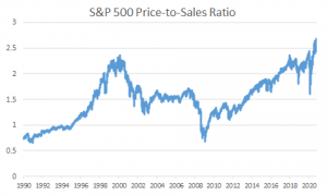 Înainte de a trece la concluzii, să ne uităm pe un grafic istoric al P/S. Din păcate nu am un grafic atât de lung precum în cazul P/E. Terminalele Bloomberg au o bază de date care începe din 1990, astfel încât va fi necesar să mă credeţi pe cuvânt în ceea ce priveşte perioada anterioară. Chiar şi aşa, graficul este cât se poate de relevant: