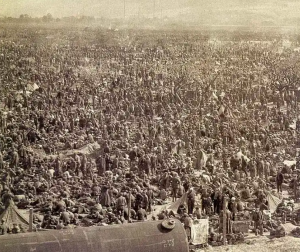 Pe un dâmb dominând acel coșmar stă un soldat cu automatul pregătit, privind apatic mulțimea torturată de foame și sete (rațiile prizonierilor erau drămuite de același Ike, care cerea lună de lună administrației micșorarea lor până la dispariție). Oare ce gândea militarul pus să îi păzească pe nefericiţii aceia desprinşi parcă din Infernul lui Dante? Sau nu gândea nimic, cum îi stă bine soldatului? (Am greşit pomenind milos de comuna primitivă. Nu, aici e vorba de oamenii cavernelor. Peste ei a plouat, a nins, a ars soarele, până au devenit una cu pământul).