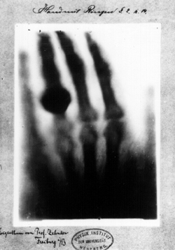 Röntgen a continuat cu mult interes studiul acestei lumini neobişnuite, pentru ca, la un moment dat, punându-și mâna în faţa razelor ei, a observat că proiecţia mâinii sale pe ecranul care se afla în spate arăta un contrast între oase, care apăreau opace, şi muşchi, care erau transparenţi. Astfel, Röntgen și-a dat seama că putea să-şi vadă întregul sistem osos. Încântat de această descoperire, a chemat-o pe soţia sa şi a invitat-o să-şi plaseze palma în faţa razelor, captând de data aceasta imaginea rezultată direct pe film fotografic. Fotografia radiologică a palmei soţiei sale avea să devină la scurt timp celebră în întreaga lume, contribuind foarte mult la adoptarea rapidă a acestei tehnici de către medicină. Prima întrebuințare medicală a avut loc la mai puţin de o lună de la descoperirea lui Röntgen.