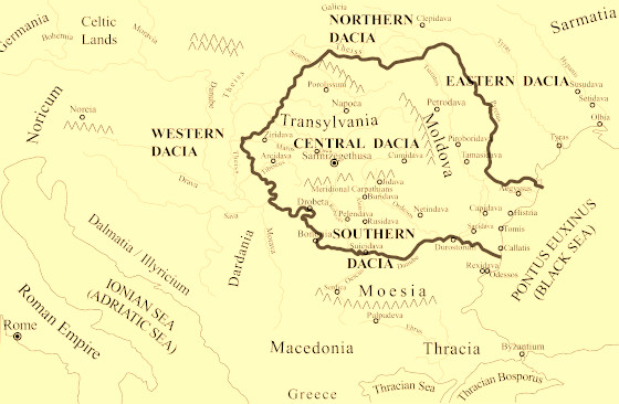 - Dionisie Periegetul (138 d.H.):„În ceea ce urmează voi scrie despre cea mai mare ţară, care se întinde din Asia Mică până în Iberia şi din nordul Africii până în Scandia, ţara imensă a dacilor.”