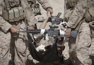 Un militar american este transportat de către camarazii lui către un elicopter medical (Medevac) după ce a fost surprins de explozia unui dispozitiv improvizat. Acest militar şi-a pierdut ambele picioare şi se chinuie să rămână în viaţă.