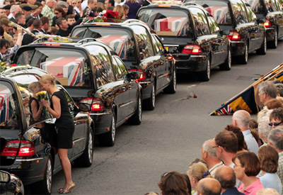 Tineri militari întorşi acasă în sicrie sudate de zinc, întrucât de cele mai multe ori nu mai rămâne decât nişte praf şi pulbere în urma acestor explozii, iar familiile nu mai au ce să vadă sau ce să recunoască.