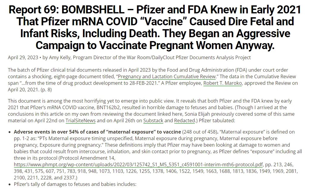 În acest raport, care a devenit viral, directorul proiectului de analiză a documentelor Pfizer, Amy Kelly, a detaliat „daunele oribile aduse fetușilor și bebelușilor”, așa cum rezultă din Raportul cumulativ al Pfizer privind sarcina și alăptarea:
