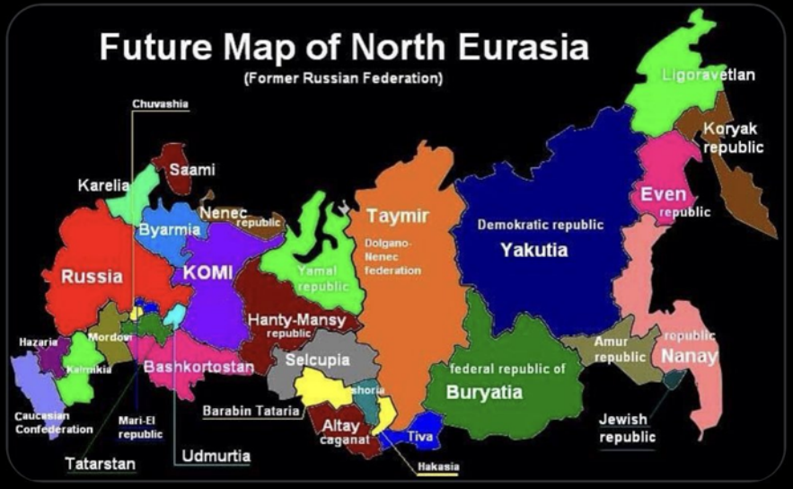 „Comisia pentru Securitate și Cooperare în Europa, o agenție guvernamentală independentă a SUA, cu membri din Camera Reprezentanților și Senatul SUA, precum și din departamentele de apărare, de stat și de comerț, a declarat că decolonizarea Rusiei ar fi necesar să fie un «obiectiv moral și strategic». Forumul Free Nations of Post-Russia, care cuprinde politicieni și jurnaliști exilați din Rusia, a organizat o reuniune la Parlamentul European din Bruxelles la începutul acestui an și anunță trei evenimente în diferite orașe americane în această lună. Forumul a publicat chiar și o hartă a unei Rusii dezmembrate, împărțită în 41 de țări diferite, într-o lume post-Putin, presupunând că acesta pierde în Ucraina și este înlăturat.