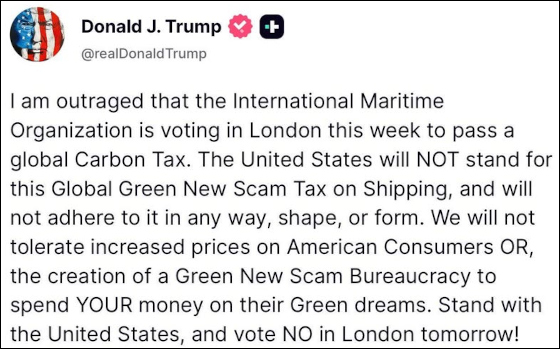 Sunt indignat că Organizația Maritimă internațională votează săptămâna aceasta la Londra o taxă globală pe carbon. Statele Unite NU vor susține această nouă escrocherie a taxei globale verzi pentru transportul maritim și nu vor adera la ea sub nicio formă. Nu vom tolera creșterea prețurilor pentru consumatorii americani sau crearea unei noi birocrații verzi înșelătoare care să cheltuie banii VOȘTRI pentru visele lor verzi. Fiți alături de Statele Unite și votați NU mâine la Londra!”