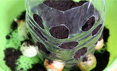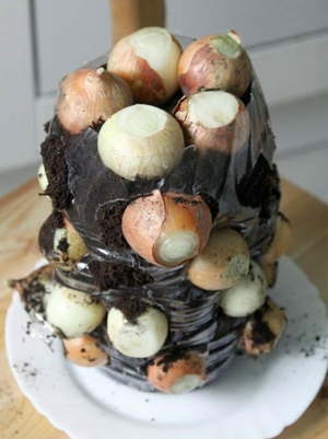 Când solul ajunge la primul nivel de găuri, aşezaţi primii bulbi de ceapă, apoi continuaţi să umpleţi recipientul cu pământ, repetând plantarea la fiecare nivel. Odată finalizată operaţiunea, puneţi recipientul pe o farfurie. Udaţi pământul la fiecare 4 zile.