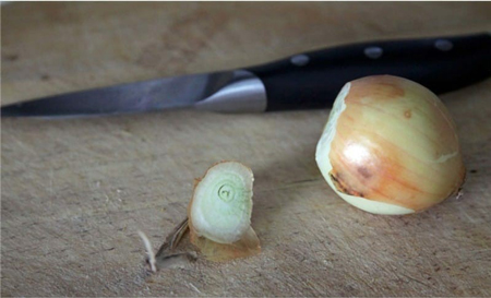 1. În primul rând, este necesar să pregătiți ceapa pentru cultura forțată. Curățați stratul superficial de coajă și tăiați partea superioară (1-1,5 cm) așa cum este prezentat în imagine. În cazul în care ceapa este germinată, această tăiere nu este necesară.