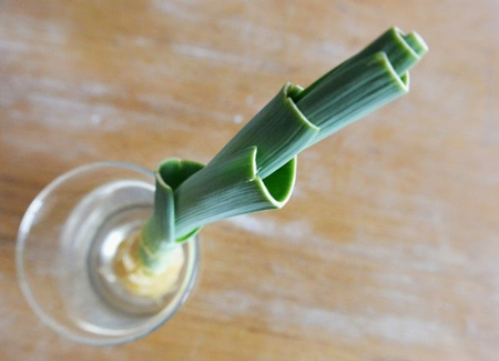 – Dacă vă place ideea, aflați că puteți să vă diversificați culturile de pervaz. Într-un mod similar puteți cultiva prazul. Tăiați frunzele verzi și apoi așezați rădăcina albă într-un pahar cu puțină apă (1 cm). Așteptați timp de 2 săptămâni, perioadă în care este necesar să înlocuiţi zilnic apa, până se dezvoltă sistemul de rădăcini. Când încep să apară lăstarii tineri, prazul poate fi transplantat în pământ.
