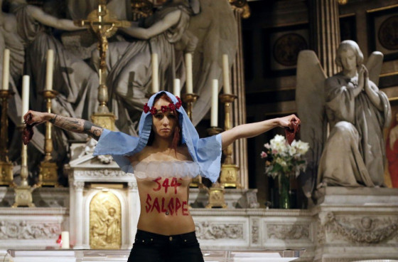 Grupul ucrainean Femen, în numele căreia Bouton a oripilat biserica, a sărbătorit decizia, scriind pe internet „Crăciunul este anulat” și „sfânta mamă Eloise a avortat embrionul lui Iisus pe altarul din la Madeleine”.