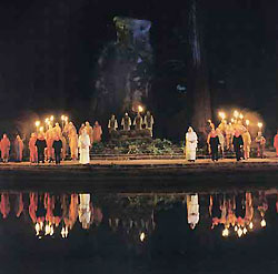 Statuia uriaşă în formă de bufniţă este reprezentarea divinităţii babiloniene Moloch, despre care în Biblie scrie că i se aduceau sacrificii umane, mai precis îi erau sacrificaţi copii. Pe altarul aflat la baza statuii este aprinsă „flacăra sacră” în care este arsă „jertfa”. Se afirmă că nu este arsă o victimă umană, ci o „efigie” – un fel de păpuşă. Totul este montat grotesc, ca o piesă de teatru în care victima urlă, se zbate şi cere îndurare. În schimb asistenţa, care urmăreşte ritualul de pe malul opus al lacului, aplaudă, tropăie şi ovaţionează.