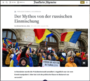 Articolul publicat sub semnătura lui Michael Martens, corespondentul pentru Europa de Răsărit al publicației apropiate cercurilor politice creștin-democrate germane, se intitulează „Mitul interferenței ruse” și se întreabă dacă motivul anulării alegerilor din România chiar „a fost o manipulare de la Kremlin” sau dacă, de fapt, clasa politică de la București a pierdut un pariu „și caută acum să arunce vina pe cineva”.