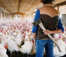 Nu există nicio lege în SUA pentru a reglementa tratamentul păsărilor în timpul prinderii, procesului de transport și sacrificare. Odată ajunși la abator, aceștia sunt spânzurați de picioare și electrocutați de un paralizator electric sau sunt alergați printr-o baie de apă electrificată, astfel încât penele lor să iasă mai ușor. Ei sunt conștienți în tot acest proces și abia apoi li se taie gâtul. Același lucru se întâmplă în abatoare cu porcii, vacile etc.