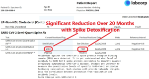 Reține că anticorpii reprezintă o reflexie indirectă a proteinei Spike și nu se modifică rapid. Sfatul meu este să nu verifici din nou nivelul lor mai devreme de un an. Mai jos este cazul unuia dintre pacienții mei care și-a rezolvat sindromul Spike prin detoxifiere; se poate observa scăderea semnificativă a nivelului anticorpilor împotriva proteinei Spike.