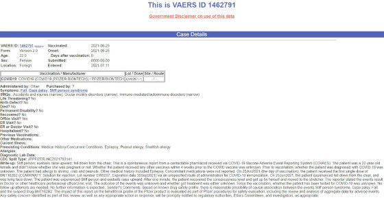 Dacă credeți că asta nu este cauzalitate, atunci explicați raportul VAERS de mai jos. Acesta arată că SPS poate începe IMEDIAT după vaccinare. Acest aspect este probabil pentru că este cauzal, deoarece șansa ca aceasta să se petreacă din „ghinion” este foarte mică. Amintiți-vă, a existat doar 1 raport pentru vaccinul antigripal în 32 de ani. Care credeți că este șansa ca un SPS spontan să apară în aceeași zi cu o vaccinare covid? Foarte aproape de zero.