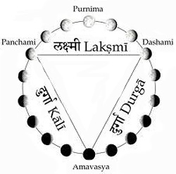 16. TRIPURA SUNDARI. Această fază este una cu totul specială, considerată faza cea mai benefică a Lunii. Ea se suprapune cu ziua a 13-a, pentru că se manifestă, ca influenţă energetică, aproximativ cu 48 de ore înainte de Luna Plină. În „O mie şi una de nopţi”, comparativul cel mai frecvent pentru femei este „frumoasă ca Luna în a 14-a noapte”, deci noaptea imediat următoare acestei zilei. Astrologia hindusă numeşte această fază „ziua lui TRIPURA SUNDARI, cea care este cea mai frumoasă în toate cele trei Lumi”, caracterizată de energiile frumuseţii, armoniei, succesului, iubirii. În această zi se încep acţiuni şi au loc întâlniri importante, se iau decizii majore, se dau examene. Este o zi prin excelenţă benefică şi chiar indicată pentru a face dragoste, mai ales pentru cuplurile care practică în mod obişnuit continenţa sexuală (controlul asupra energiei sexuale).