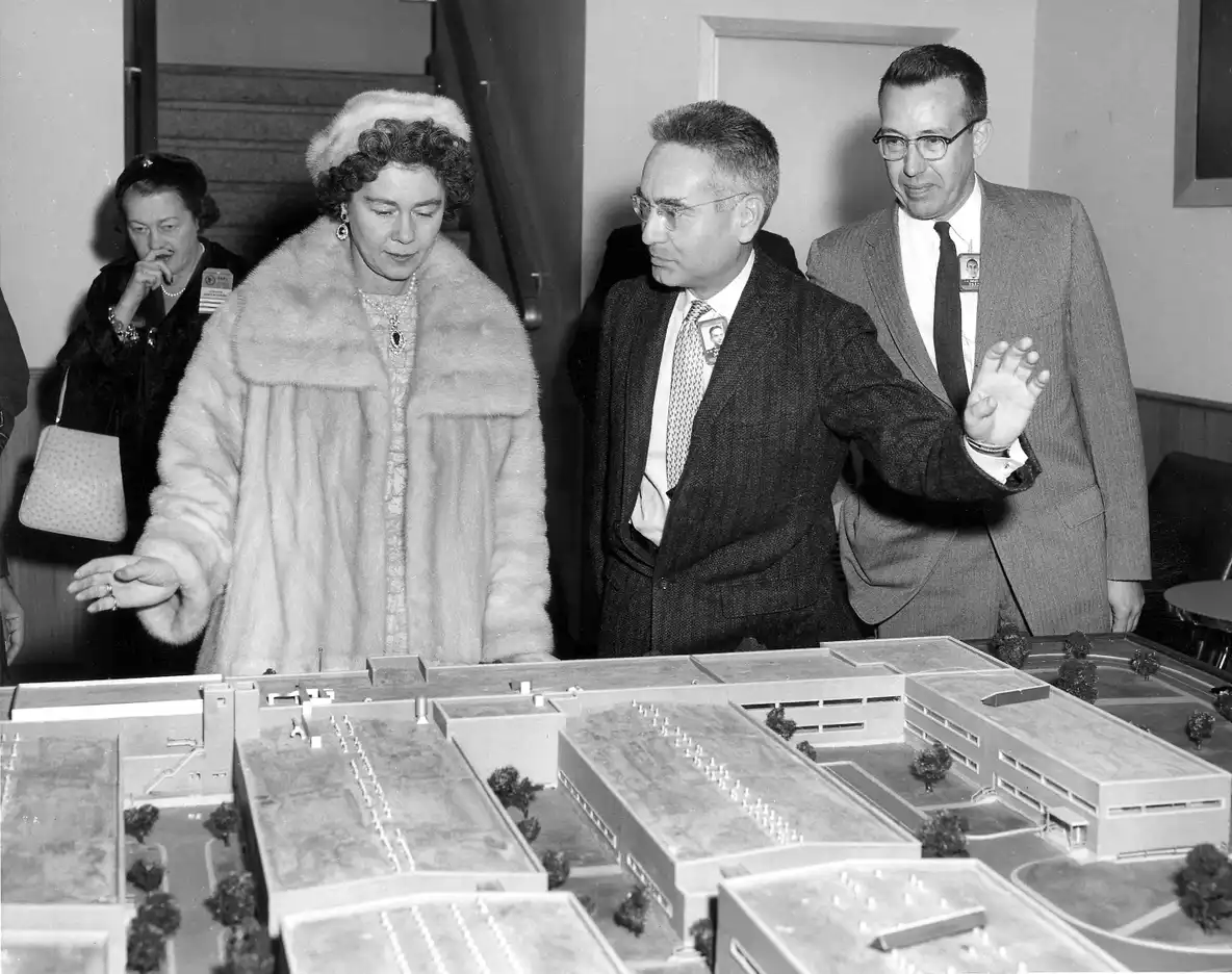 Directorul Laboratorului Național Oak Ridge, Alvin Weinberg, în centru, îi prezintă reginei Frederika a Greciei reactorul de cercetare Oak Ridge, pe 7 noiembrie 1958.