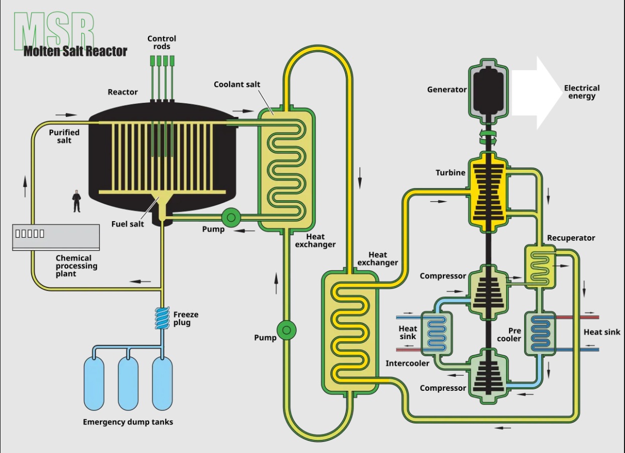 Ca să fie clar: în acest concept MSR, aceste săruri topite fierbinți, amestecate cu combustibil nuclear, este necesar în cele din urmă să încălzească apa (sau un alt gaz, așa cum vom vedea mai târziu) până la apariția aburului pentru a acționa turbinele și a genera electricitate – același principiu de bază ca în reactoarele convenționale. Dar iată diferența crucială: sarea topită radioactivă curge prin țevi metalice, unde încălzește apa curată de cealaltă parte, fără ca cele două să se amestece vreodată. Aceasta înseamnă că sărurile radioactive rămân complet separate în propria lor buclă închisă, în timp ce doar abur curat, neradioactiv, ajunge la turbine. Dacă există o scurgere în sistemul de abur, nu se eliberează material radioactiv în mediu, ci doar apă curată.