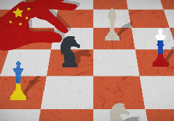 Qu Xing, ambasadorul Chinei în Belgia, a declarat că actuala criză ucraineană a apărut ca urmare a „jocului” (metaforă asemănătoare utilizată de strategul american Zbigniew Brzezinski, care vorbește despre un „mare eșichier”) dintre Rusia și Occident, care nu s-a diminuat, în ciuda prăbușirii Uniunii Sovietice.