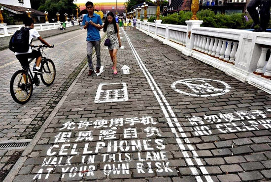Pentru a face trotuarele mai sigure pentru persoanele în vârstă și pentru copii, autoritățile orașului Chongqing, China, au despărțit trotuarul în două benzi, una fiind destinată celor care folosesc telefonul mobil.