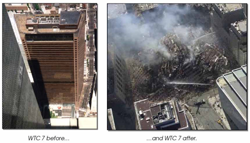 World Trade Center 7 collapsed into its own footprint at 5:20 pm, seven hours after the destruction of WTC 1 and 2. The building shocked witnesses by coming down at the speed of freefall, indicating that it encountered zero resistance on the way down.