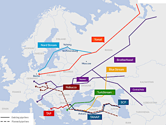 – în Nord conductele Nord Stream I și II, fiecare cu o capacitate anuală de câte 55 miliarde de metri cubi;