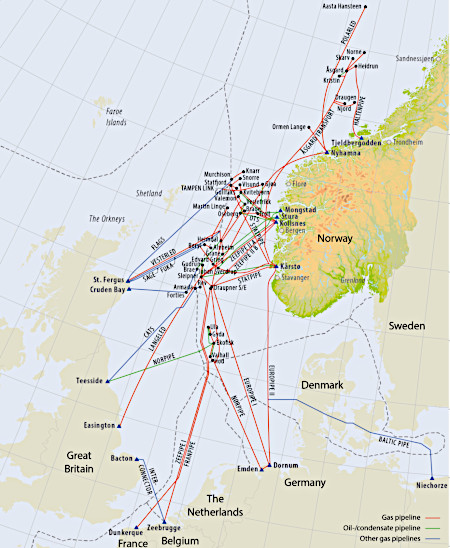 Sursele de gaze pentru Europa mai includ conductele norvegiene, cu o capacitate totală de 120 de miliarde de metri cubi pe an: