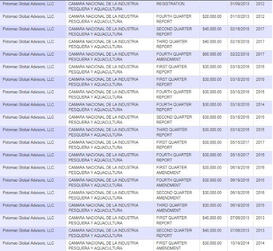 Mark John Robertson, şeful Potomac Global Advisors LLC, înregistrat de 6 ani ca lobbyist în Congresul SUA, cu unic contract: Camera Naţională a Industriei de Pescuit şi Acvacultură din Mexic. A obţinut până acum 770.000 de dolari de la mexicani, ocupându-se de produsele din ton.