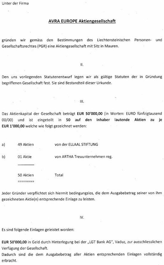 Documentele Registrului Comercial din Liechtenstein/Office of Justice mai arată că Avra Europe SA a fost înfiinţată de la bun început tot ca o societate pe acţiuni, cu un capital de 50.000 de euro.