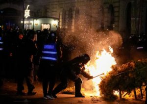 Bineînțeles, s-au găsit niște semnături ilizibile pe listele de susținători ai Georgescului, care să justifice respingerea candidaturii, unii semnaseră cu cerneală bleu-ciel în loc de bleu-marin, și gata ilegalitatea. Ghiuleaua cu lovitura de stat nu era ca să îl dea pe el jos, ci să îi sperie pe cei care ar fi îndrăznit să îl mai susțină, că de, cine se mai apropie de el știind că se poate face complice la o „lovitură de stat”? Și ca treaba să fie clară, în seara în care s-a anunțat mazilirea mazilitului, printre susținătorii acestuia au apărut și s-au manifestat violent și niște profesioniști ai scandalurilor cu jandarmii, cărora ca să nu vină cu pietrele de acasă să le rupă buzunarele, li s-au pus la dispoziție prin grija edililor și niște bucăți de piatră cubică, de la niște „lucrări” exact în zona protestelor. Și uite așa, scenariul e gata, actorii profesioniști și-au jucat rolul, au aruncat cu pietre în jandarmi, în geamuri, au dat foc la baracă, au răsturnat mașini, dar culmea, nu i-a văzut nimeni, nu i-a fotografiat nimeni, nu se știe cine cine sunt, sunt protestatarii, iar imaginea lui Georgescu uzurpatorul este completă.