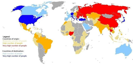 Trafic d’êtres humains des pays d’origines (en jaune : nombre limité et en rouge : nombre important) et de destinations (en bleu clair : nombre important et en bleu foncé : nombre très important) – Own work – Mai 2011.