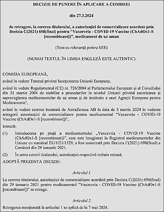 Comisia Europeană a retras, la cererea gigantului farmaceutic AstraZeneca, autorizația de comercializare în statele membre a vaccinului dezvoltat de compania anglo-suedeză împotriva covid-19, vaccin cunoscut sub numele „Vaxzevria”, folosit inclusiv în România. Decizia se aplică începând cu data de 7 mai 2024, conform documentului oficial publicat pe site-ul Comisiei.