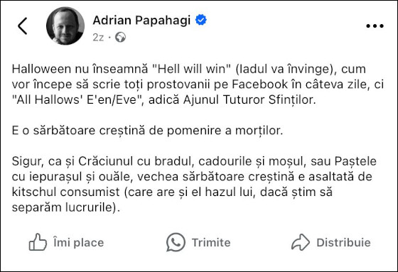 Într-o postare pe facebook, Papahagi i-a numit „prostovani” pe cei care cred că așa-zisa sărbătoare ar avea legături cu demonismul și a comparat monștrii de Halloween cu ouăle roșii de Paști.