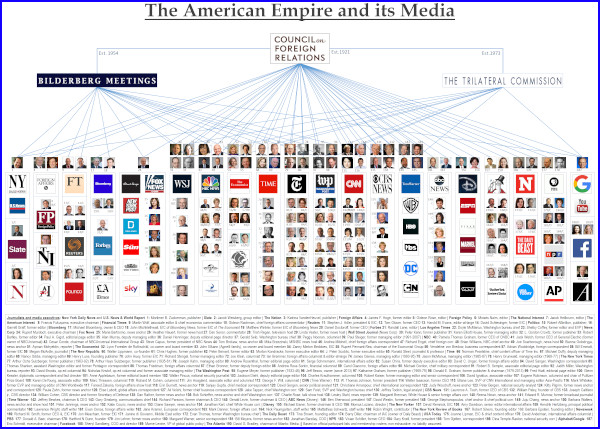 În SUA, de fapt, aproape toate instituțiile media bine cunoscute au fost fondate de reprezentanți ai CFR sau au fost cumpărate cu zeci de ani în urmă (a se vedea figura de mai jos). Acest fapt a fost posibil deoarece funcționarea unei mass-media influente a necesitat anterior resurse financiare considerabile, precum și acces la factorii de decizie politică – iar Consiliul și membrii săi le au pe ambele la dispoziție, ca aproape nicio altă grupare. Chiar și companiile moderne de internet, precum Google și Facebook, sunt implicate în rețeaua Consiliului la cel mai înalt nivel – și uneori și în operațiunile sale internaționale.
