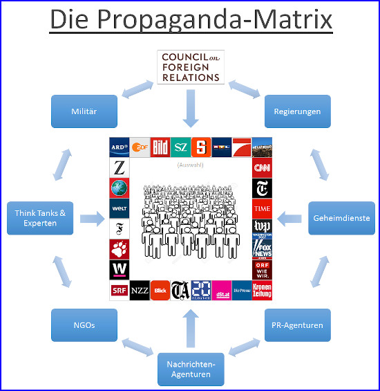 Consiliul a adoptat o abordare mai inteligentă: Cu cei aproape 5.000 de membri ai săi, a creat un sistem de informații aparent divers și independent, în care, totuși, aproape toate sursele și punctele de referință relevante sunt controlate de membrii CFR și de organizațiile partenere ale acesteia. În acest fel, a fost creată o „matrice de propagandă” unică din punct de vedere istoric, ale cărei elemente și funcționare sunt prezentate mai jos.