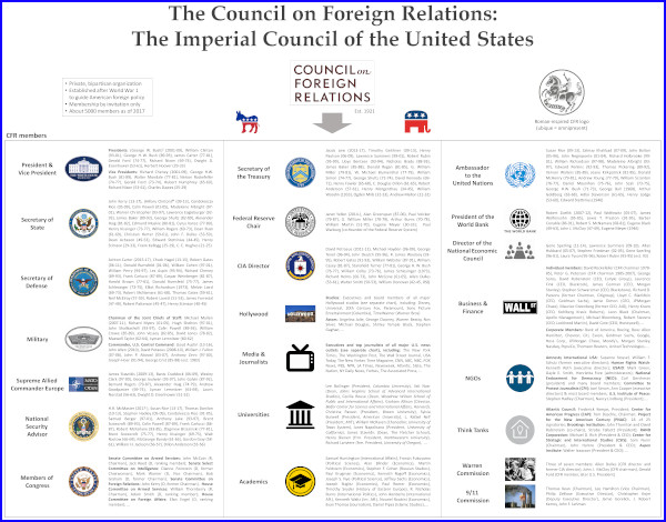 În acest fel – la numai 170 de ani de la Declarația de Independență – a luat naștere un imperiu american global, ale cărui poziții cheie au fost de atunci ocupate aproape continuu de cei aproape 5.000 de reprezentanți ai CFR (a se vedea figura următoare și lista pe administrații). Prin urmare, revista Der Spiegel a descris Consiliul drept „cea mai influentă instituție privată din America și din lumea occidentală” și un „politburo pentru capitalism”.