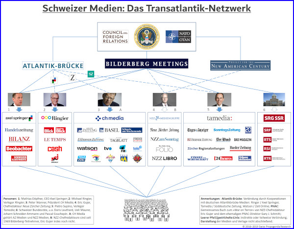 Prin urmare, în chestiuni geopolitice sau imperiale, mass-media elvețiene consacrate raportează, de asemenea, în mare parte în conformitate cu CFR și NATO. Această conformitate este favorizată de concentrarea tot mai mare a mass-media, care a dus la faptul că peste 90% din piața elvețiană este controlată în prezent de numai cinci case de presă. Integrarea structurală a acestor editori are loc în primul rând prin intermediul Grupului Bilderberg, precum și printr-o cooperare din ce în ce mai strânsă cu mass-media germană Atlantic Bridge.