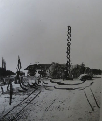 Schiţă a viitoarei Coloane a Infinitului, desenată de Brâncuşi pe o fotografie făcută în locul unde urma să aibă loc construcţia